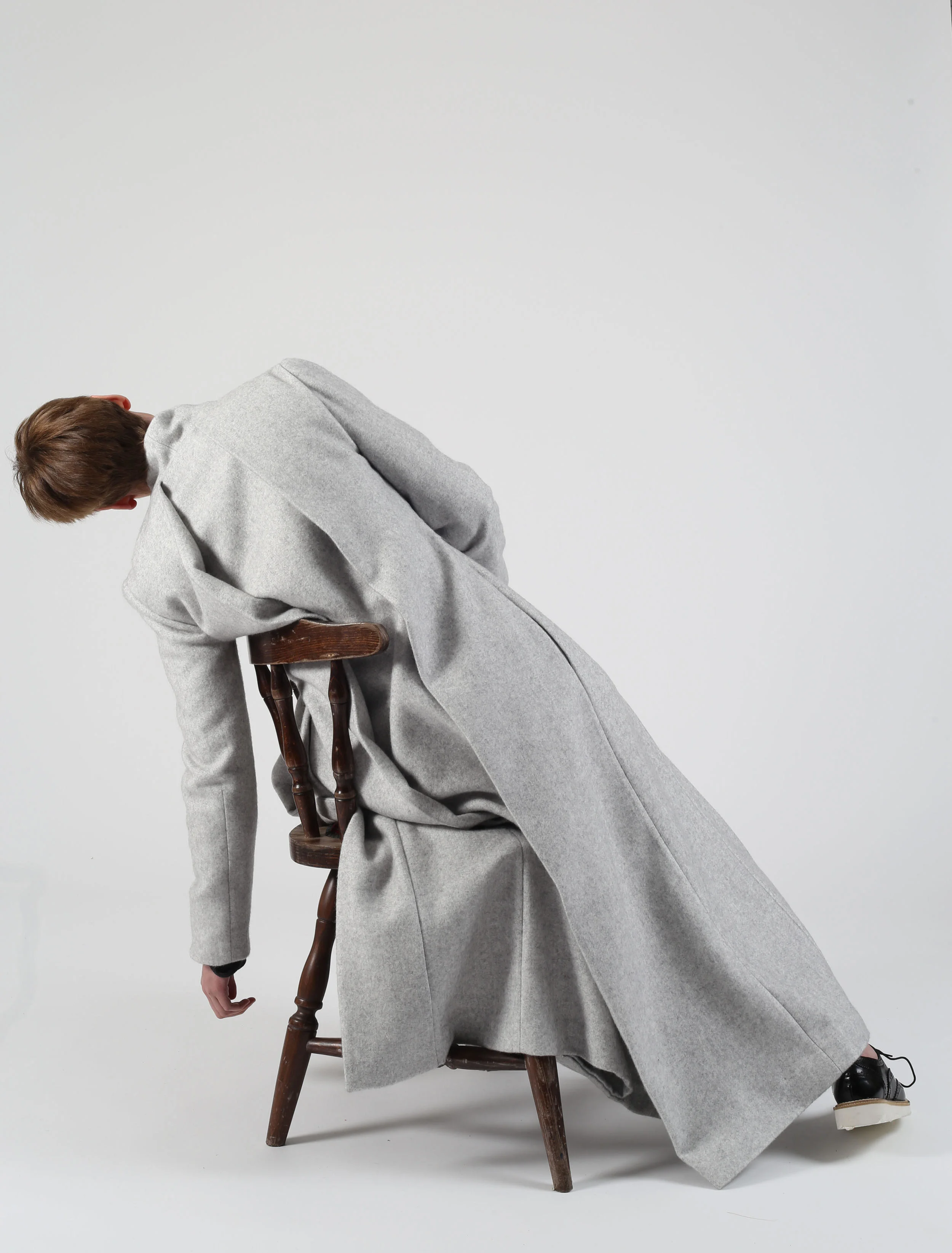 So I took photos on the streets to get the inspiration to support my idea and add life to my story. I took inspiration from farmers, tramps, workers and some poor children. For example, some famers fold their coats on their waist, some workers put a towel on their neckline, some children carry big baskets and so on. I have combined them with tailoring elements to create new silhouettes which contain the element between rich and poor. In the collection, I use a lot of knitting and wool fabric mixed with different rope decoration. I have dyed some materials and designed my own embroidery in an abstract way. In addition, I focus on creating geometric shapes such as an oversize top with a slim waist, one garment but multiple dress styles, double collar coat and so on to show people the story I want to tell.